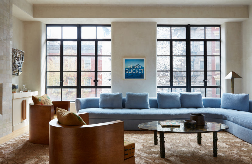 Color is the catalyst, six floors dipped in a saturated palette of deep emeralds, mauves, pistachios, and cotton candy blues. A traditional delineation of functional spaces allows for each room to be dialed to their own frequency — cool in the sunlight-suffused sitting room, emotive in the dining spaces, calm in the private ones. Custom furniture throughout the project was purpose-built: a massive table for large-format dinners; perfectly nestled storage; a pair of club chairs, a collaboration with Green River Project and Bode, features corduroy upholstery referencing the couple’s deep New York City roots. The home’s spiral staircase is clad in a raised plaster balustrade, a nautilus shell finished in an imperfect childlike hand, like a funny putty Guggenheim spiral, sized for home.