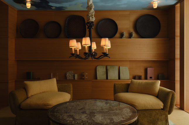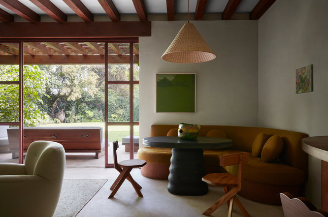 Natural materials pull from the landscape: tile tables, woven chairs, a built-in basin of Italian ceppo stone. The kidney bean-shaped pool, realized in collaboration with landscape architect Raymond Jungles, invites repose, a moment of solitude before the next one: an outdoor soaking tub of carved onyx cusped by latticed wood, an extension of one of the Studio’s house forms.